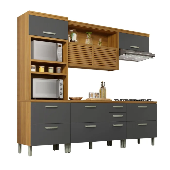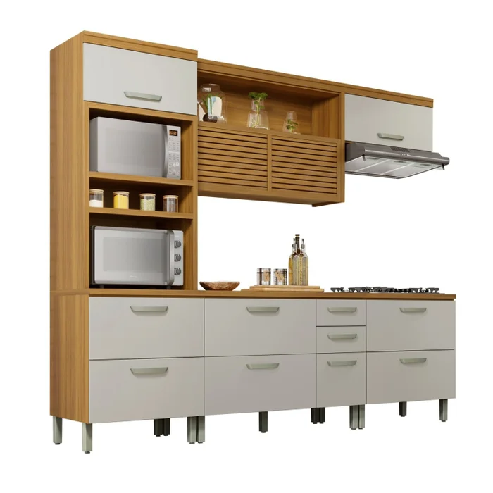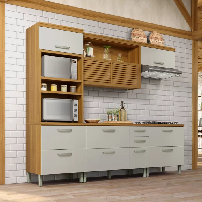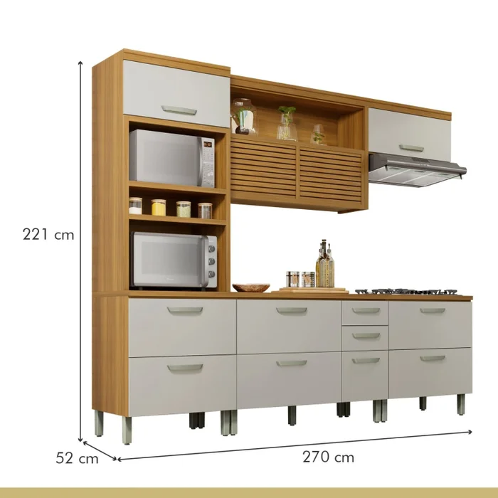 ALTURA: 221cm LARGURA: 270cm PROFUNDIDADE: 52cm – Puxadores em ABS – Corrediças telescópicas – Organizador de talheres